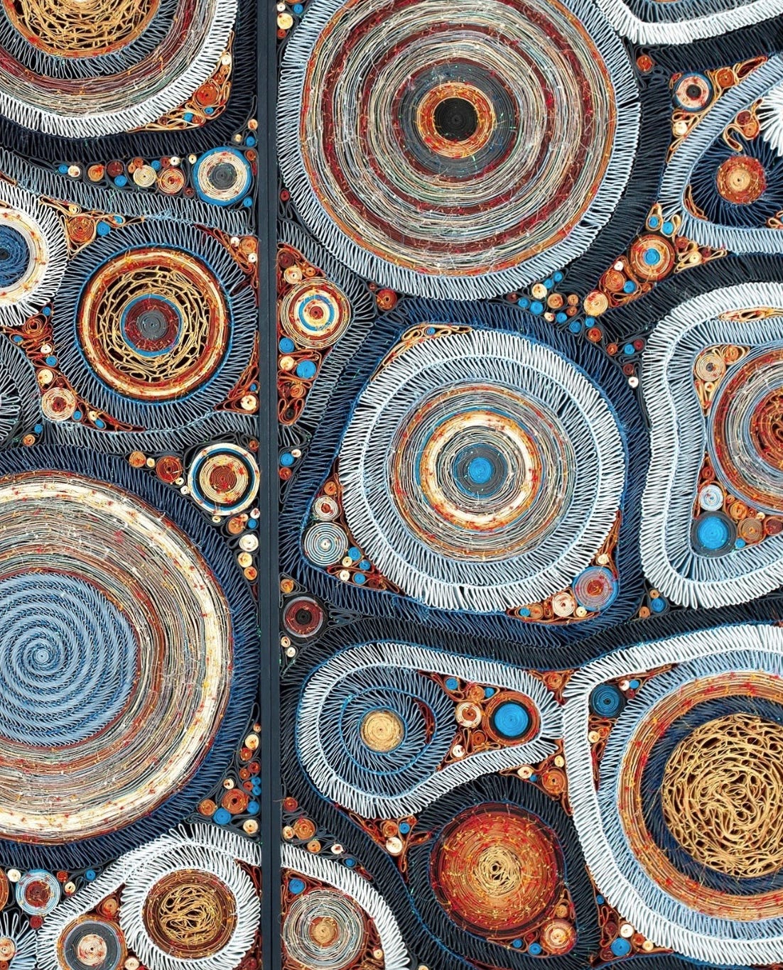 acrylic-painted canvas cut into strips and sewn, mounted on wood panels