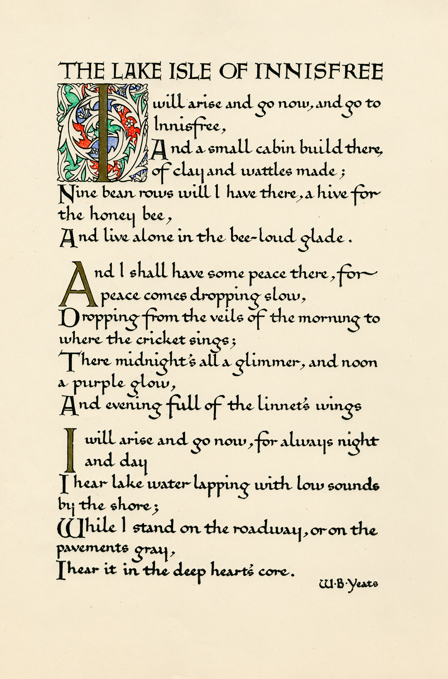 “The Lake Isle of Innisfree” was first published in The National Observer in Britain in 1890. It was next published as a broadside by William Butler Yeats’ sister, Elizabeth, at her Cuala Press.
