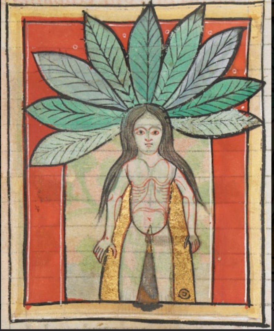 Mandragora, female, 1195, De herbis femininis, Sloane MS 1975, Fol. 49r. The British Library